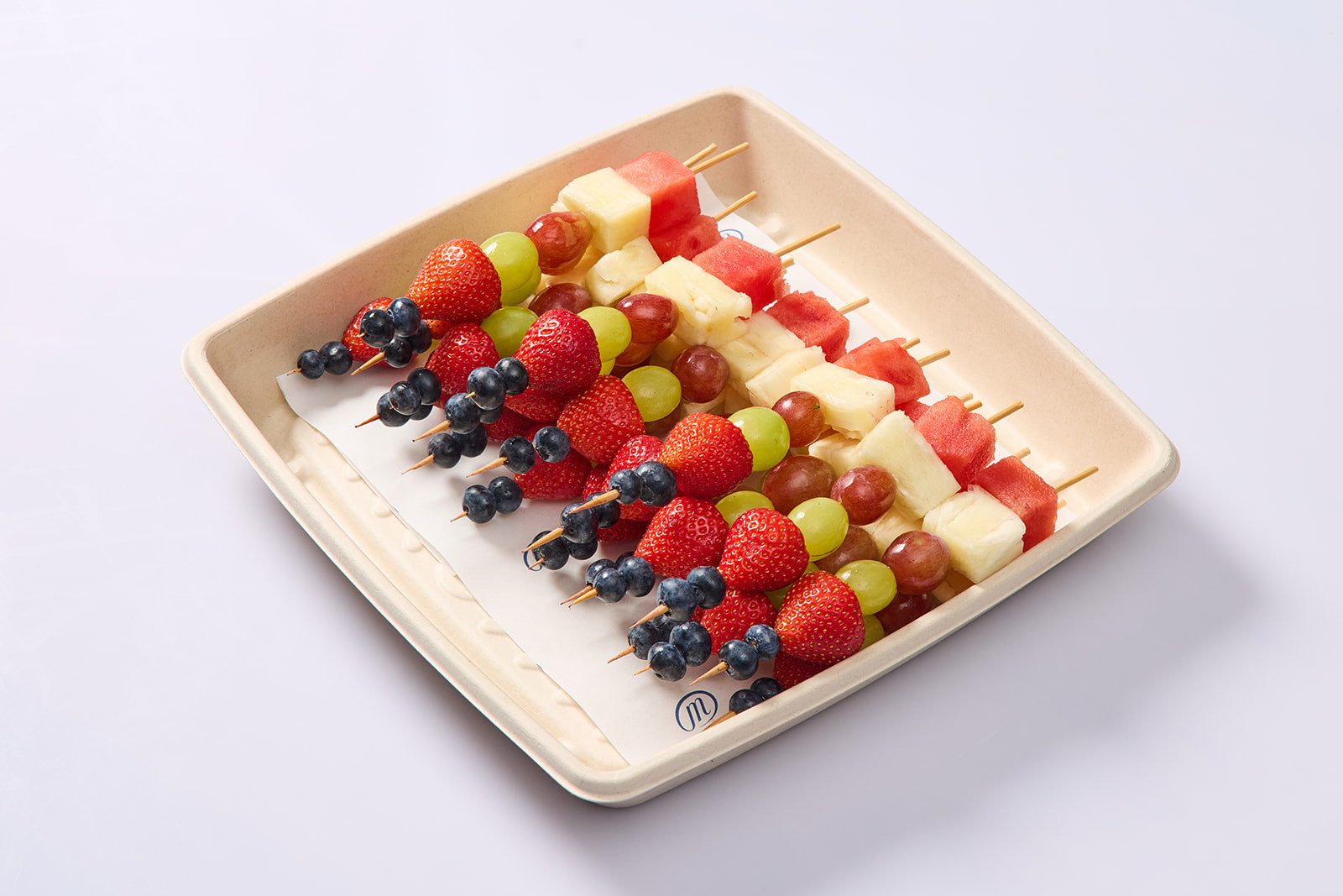 Selection of seasonal fresh fruits cut into skewers.