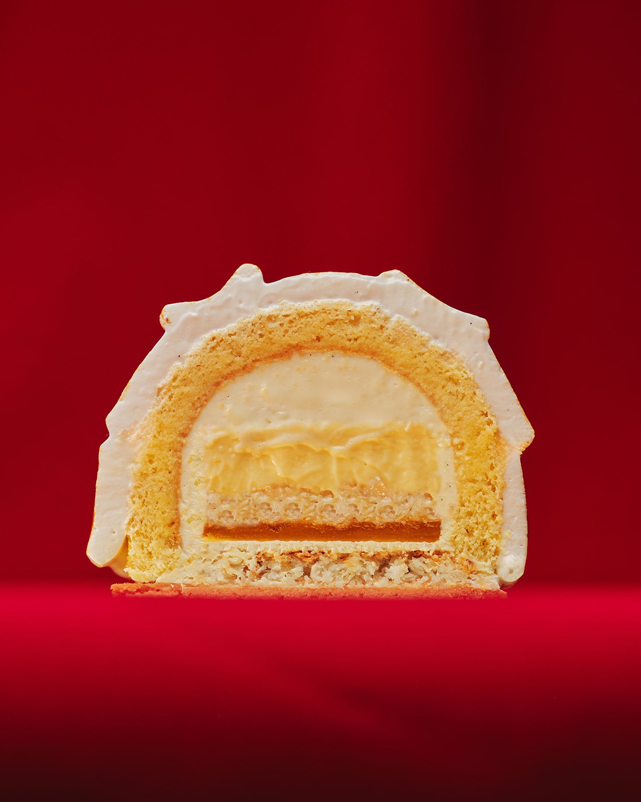 Vanilla sponge, orange mango jelly, lemon curd, coconut shortbread, vanilla namalaka, coconut dacquoise, Italian meringue, crunchy pearls
